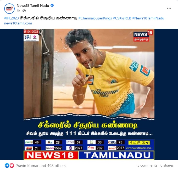 இந்நிலையில், இச்செய்தியை பதிவிட்டுள்ள News 18 தமிழ்நாடு, அதில் கடந்த 2022ஆம் ஆண்டு சிவம் துபே, தான் உடைத்த கண்ணாடியுடன் காட்சி தரும் புகைப்படத்தை உபயோகித்து, நேற்றைய போட்டியில் 111 மீட்டர் சிக்ஸரில் சிவம் துபே உடைத்த கண்ணாடி என்று பகிர்ந்துள்ளது.