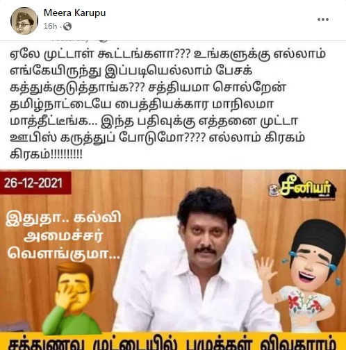 இச்சூழ்நிலையில், “சத்துணவு முட்டையில் புழுக்கள் விவகாரம். கோழிகள் அதிக புழுக்களை தின்றதால் ஏற்பட்டு இருக்கலாம். இதேபோல் மற்றொரு சம்பவம் நடக்காமல் இருக்க மாண்புமிகு தளபதி அரசு உரிய நடவடிக்கை எடுக்கும்” என்று பள்ளிக்கல்வித்துறை அமைச்சர் அன்பில் மகேஷ் கூறியதாக நியூஸ் கார்டு ஒன்று சமூக வலைத்தளங்களில் வைரலாகிறது.