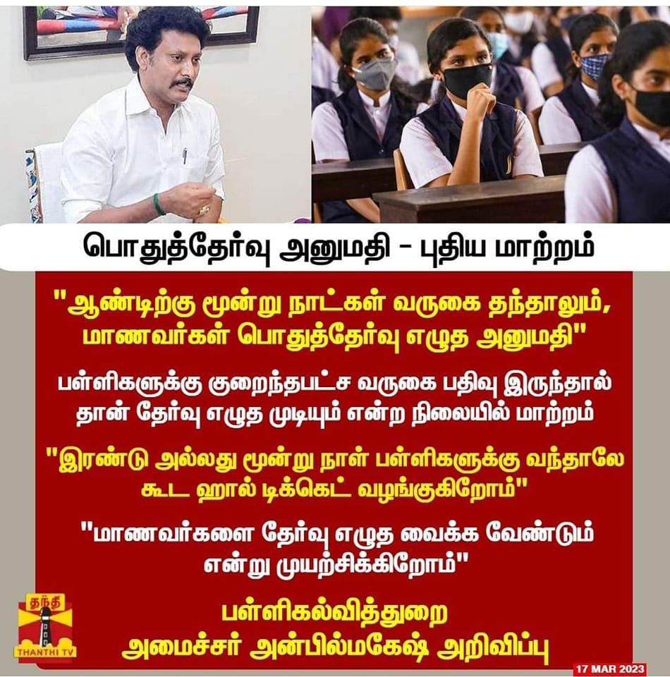 இந்நிலையில், பள்ளிக்கல்வித்துறை அமைச்சர் அன்பில் மகேஷ், மார்ச் 16ஆம் தேதியன்று கல்லூரி நிகழ்ச்சி ஒன்றின் பின் பத்திரிக்கையாளர்கள் சந்திப்பில் பொதுத்தேர்விற்கு மாணவர்கள் வராததற்கான காரணங்கள் உட்பட பலவற்றிற்கு விளக்கமளித்தார். அதில், “2021-22ஆம் கல்வியாண்டில் நாம் ஆராய்ந்த வரையில் பள்ளி இடைநின்ற மாணவர்களைக் கண்டறிந்து அவர்களை மீண்டும் பள்ளிகளில் சேர்த்துள்ளோம். ஆனால், இடைநின்றலில் கண்டறியப்பட்ட மாணவர்களில் சிலர் 2022-23 கல்வியாண்டில் 4 முதல் 5 நாட்கள் மட்டுமே மொத்தமாகவே பள்ளிக்கு வருகை தந்துள்ளனர். எனினும், அவ்வாறு வருகை பதிவு குறைவாக உள்ள இடைநிற்றல் மாணவர்களுக்கும் தேர்வு எழுத அனுமதிச்சீட்டு வழங்குமாறு அறிவுறுத்தியுள்ளோம். ஏனெனில், அவர்களை தேர்வு எழுத அனுமதிச்சீட்டே வழங்காமல் அந்த மாணவர்களை தடுத்தால் அவர்களை மீண்டும் பள்ளிக்கு வரவழைக்கவே முடியாது. அவர்களுடைய கல்வியும் பாதிக்கப்படும். இடைநிற்றல் மாணவர்களுக்கு தேர்வு குறித்த பயம் அல்லது சமூகம், பொருளாதாரம் சார்ந்த சிக்கல்கள் உள்ளதா என்பது குறித்தும் ஆராய முடிவெடுத்துள்ளோம்” என்று பேசியிருந்தார்.