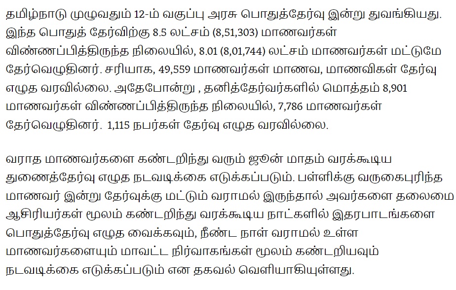 தமிழகம் மற்றும் புதுச்சேரியில் பிளஸ்-2 பொதுத் தேர்வுகள் மார்ச் 13ஆம் தேதியன்று துவங்கியது. தேர்வு முதல்நாளே 49,559 மாணவர்கள் தேர்விற்கு விடுப்பு எடுத்திருந்தனர்.