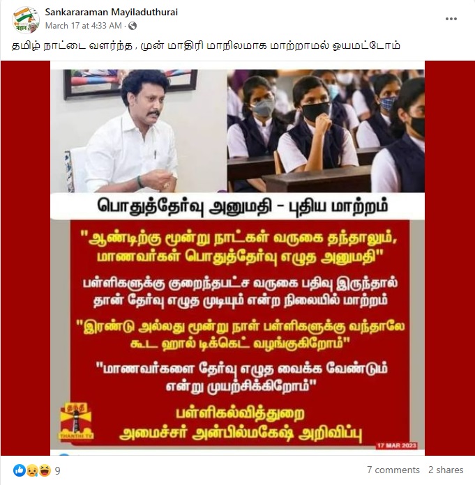 பள்ளிக்கு மாணவர்கள் 3 நாட்கள் வந்தாலே தேர்வு எழுத அனுமதி என்று பள்ளிக்கல்வித்துறை அமைச்சர் அன்பில் மகேஷ் கூறியதாகப் பரவிய செய்தி குறித்த உண்மையறிய அதுகுறித்த ஆய்வில் ஈடுபட்டோம்.