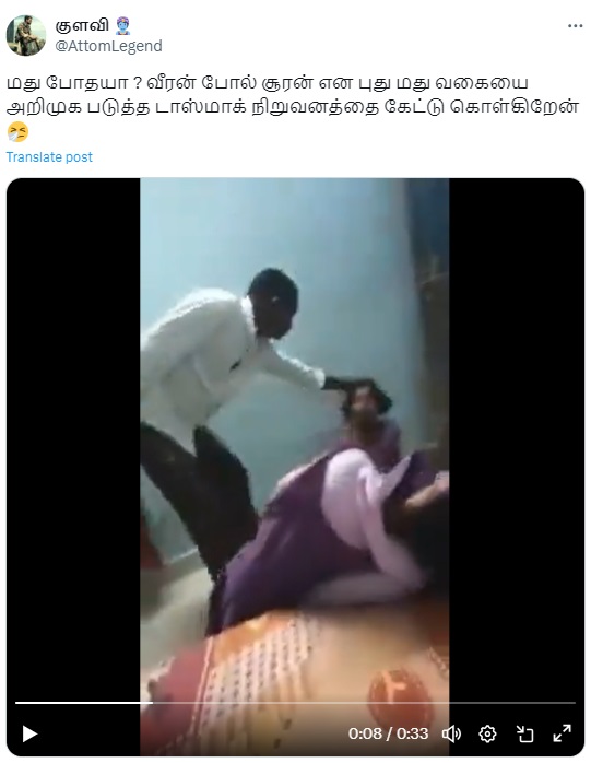 “மது போதையா ? வீரன் போல் சூரன் என புது மது வகையை அறிமுக படுத்த டாஸ்மாக் நிறுவனத்தை கேட்டு கொள்கிறேன்” என்று இந்த வீடியோ பரவி வருகிறது.