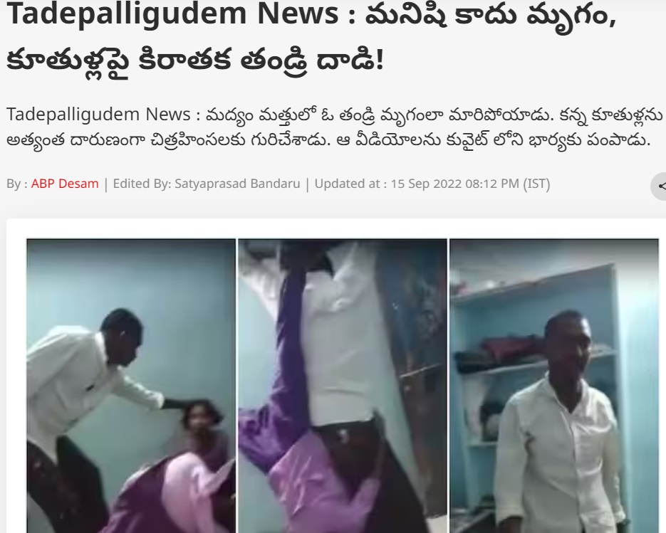 தொடர்ந்து நாம் தேடியதில், ஆந்திர மாநிலம், மேற்கு கோதாவரி மாவட்டம், தாடேபள்ளிக்குடம் பகுதியில் கஞ்சி டேவிட் ராஜூ என்கிற ரவி என்னும் நபர் குடிபோதையில் மனைவி வெளிநாட்டில் இருந்த நிலையில் தனது இரண்டு பெண் குழந்தைகளையும் தாக்கிய நிலையில் இந்த வீடியோ வைரலானதால் உடனடியாக பென்டபாடு காவல்துறையினர் சம்பவ இடத்திற்கு விரைந்து சென்று குழந்தைகளை மீட்டனர் என்று கடந்த செப்டம்பர் 15, 2022 அன்று ABP Telugu செய்தி வெளியிட்டுள்ளது. ஆனால், அவரது மனைவி வெளிநாட்டில் இருந்து திரும்பிய நிலையில் கடந்த 2023ஆம் ஆண்டில் மீண்டும் மனைவியுடன் சேர்ந்து வாழ அவரை தாய் வீட்டில் இருந்து அழைத்து வந்த டேவிட் ராஜூ அவரையும் கொன்று விட்டு தானும் பூச்சி மருந்து குடித்து இறந்ததாக Times Of India செய்தி வெளியிட்டுள்ளது.