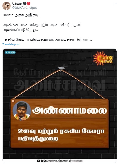 மேலும், வைரலாகும் அமைச்சர் பதவி கேலி செய்யும் வகையிலும், அண்ணாமலை உண்மையில் அமைச்சரவையில் தற்போது இடம்பெறவில்லை என்பதும் நமக்குத் தெரிய வந்ததால் இதுகுறித்து சன் நியூஸ் டிஜிட்டல் பிரிவு பொறுப்பாளர் மனோஜ் கார்த்திக்கை தொடர்பு கொண்டு கேட்டோம்.