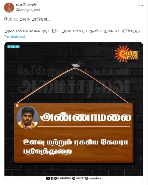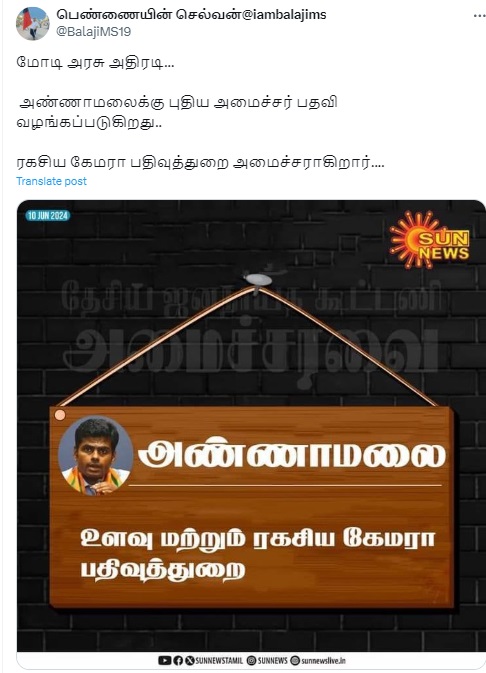 ”மோடி அரசு அதிரடி…அண்ணாமலைக்கு புதிய அமைச்சர் பதவி வழங்கப்படுகிறது..ரகசிய கேமரா பதிவுத்துறை அமைச்சராகிறார்” என்று இந்த நியூஸ்கார்ட் வைரலாகிறது.
