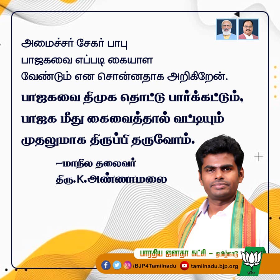 தமிழக பாஜக தலைவர் அண்ணாமலை சமீபத்தில், “அமைச்சர் சேகர் பாபு பாஜகவை எப்படி கையாள வேண்டும் என சொன்னதாக அறிகிறேன். பாஜகவை திமுக தொட்டு பார்க்கட்டும், பாஜக மீது கைவைத்தால் வட்டியும் முதலுமாக திருப்பி தருவோம்!” என்று பத்திரிக்கையாளர் சந்திப்பு ஒன்றில் பேசி இருந்தார்.