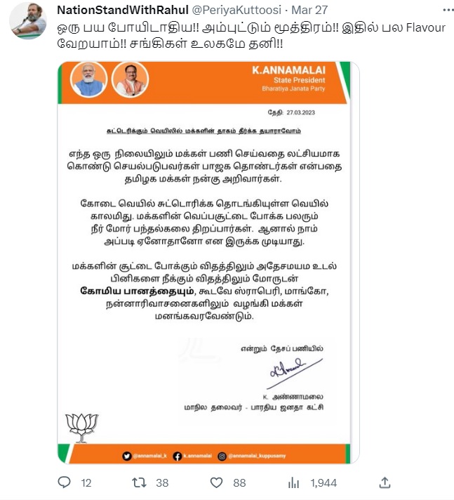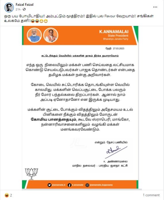 கோமிய பானம் மூலமாக சுட்டெரிக்கும் வெயிலில் மக்களின் தாகம் தீர்ப்போம் என்று பாஜக தமிழ்நாடு சார்பாக மாநிலத் தலைவர் அண்ணாமலை அறிக்கை வெளியிட்டதாகப் புகைப்படம் ஒன்று சமூக வலைத்தளங்களில் பரவுகிறது.