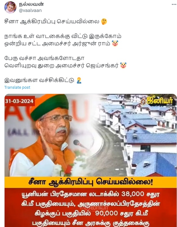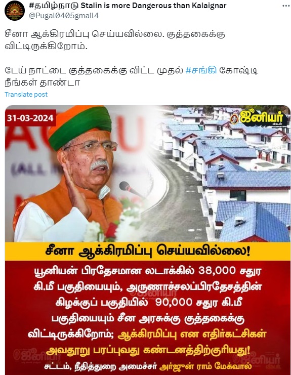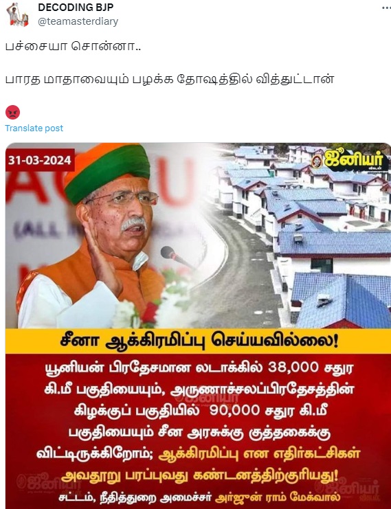 அருணாச்சல் பகுதிகளை சீனாவிற்கு குத்தகைக்குத்தான் விட்டிருக்கிறோம்; அவர்கள் ஆக்கிரமிப்பு செய்யவில்லை என்று ஒன்றிய சட்டம் மற்றும் நீதித்துறை அமைச்சர் அர்ஜூன் ராம் மேக்வால் கூறியதாக நியூஸ்கார்ட் ஒன்று வைரலாகிறது.