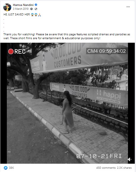 இத்தேடலில் வைரலாகும் வீடியோவானது சித்தரிக்கப்பட்ட ஒன்று என்பதை நம்மால் அறிய முடிந்தது. வைரலாகும் வீடியோ மாடல் அழகியும் நடிகையுமான ஹம்சா நந்தினி என்பவரின் ஃபேஸ்புக் பக்கத்தில் கடந்த ஆண்டு மார்ச் மாதம் பதிவிடப்பட்டுள்ளது.