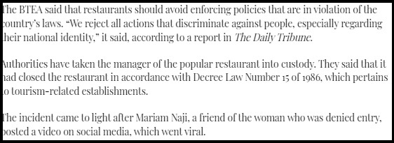 பக்ரைன் மனாமா பகுதியில் செயல்பட்டு வருகின்ற பிரபல இந்திய உணவகம் ஒன்றில் உணவருந்தச் சென்ற ஹிஜாப் அணிந்த இளம்பெண் ஒருவரை அங்கு பணிபுரியும் மேலாளர் ஒருவர் அதற்காக தடுத்து நிறுத்தியுள்ளார். ஹிஜாப் அணிந்திருந்த அப்பெண் உணவகத்திற்குள் நுழைய அனுமதி இல்லை என்று மறுத்துள்ளார்.