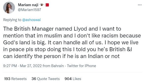 அனுமதி மறுக்கப்பட்ட ஹிஜாப் பெண்ணுடன் உணவருந்தச் சென்றிருந்த தோழியான மரியம் நஜியின் வீடியோவிற்கு பின்பாகவே இந்த நிகழ்வு வெளிச்சத்துக்கு வந்தது என்கிற நிலையில், அவரே தனது ட்விட்டர் பக்கத்தில் “அனுமதி மறுத்த மேலாளர் ஒரு இந்தியர் அல்ல; அவர் ஒரு பிரிட்டிஷ்” என்று விளக்கமளித்துள்ளார். எனவே, குறிப்பிட்ட நிகழ்விற்கு காரணமான மேலாளர் இந்திய உணவகத்தில் பணிபுரிந்த பிரிட்டிஷ் என்பது தெளிவாகிறது.