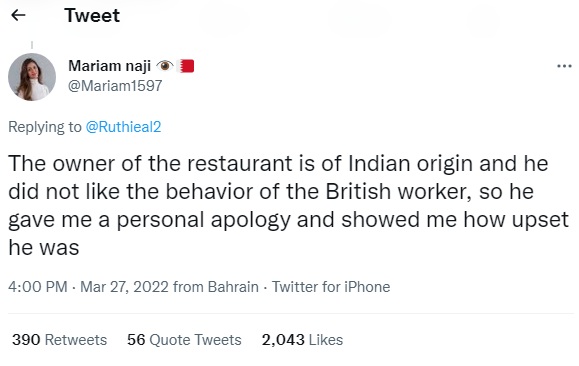மேலும், மரியமே தனது ட்விட்டர் பக்கத்தில், “Lanterns உணவகத்தின் உரிமையாளர் ஒரு இந்தியர். அவருக்கு குறிப்பிட்ட அந்த பிரிட்டிஷ் மேலாளரின் இந்தச்செயலில் சுத்தமாக உடன்பாடு இல்லை. எனவே, அவர் எங்களிடம் தனிப்பட்ட முறையில் தொடர்பு கொண்டு குறிப்பிட்ட சம்பவத்திற்காக மன்னிப்பு கேட்டுக்கொண்டார்” என்று தெரிவித்துள்ளார்.