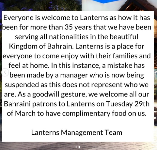 அதில், “Lanterns எல்லாரையும் வரவேற்கும் மனப்பாங்கு கொண்டது. கிட்டதட்ட 35 வருடங்களாக இந்த அழகான ராஜ்ஜியமான பக்ரைனில் அனைத்து தேசத்தவருக்கும் உணவளித்து வருகிறோம். இந்த உணவகம் அனைவரும் குடும்பத்துடன் வந்து உணவருந்தி, அவர்களுடைய வீடு போன்றே நினைக்கும் வகையிலேயே செயல்பட்டு வருகின்ற இடம்.