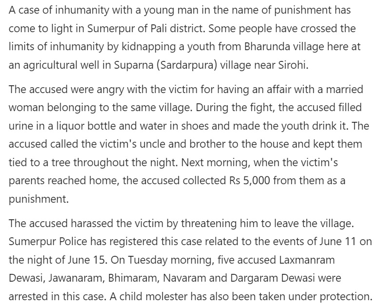 கடந்த ஜூன் 11, 2020 அன்று நடைபெற்ற இந்த நிகழ்வின்போது அந்த நபர் மேலும், மதுவுடன் சிறுநீர் கலந்து குடிக்க வைக்கப்பட்டதாகவும், இந்நிகழ்வு குறித்து சுமர்பூர் காவல்துறை ஆகஸ்டு 15 அன்று வழக்கு பதிவு செய்து 5 பேரை கைது செய்ததாகவும் தெரிவிக்கப்பட்டுள்ளது.