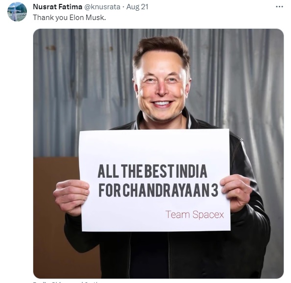 “All the best india for Chadrayan 3 – Team space X” என்கிற வாசகங்கள் அடங்கிய பதாகையை எலான் மஸ்க் கைகளில் பிடித்துள்ளதாக இந்த புகைப்படம் வைரலாகிறது.