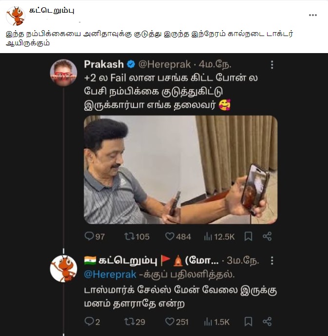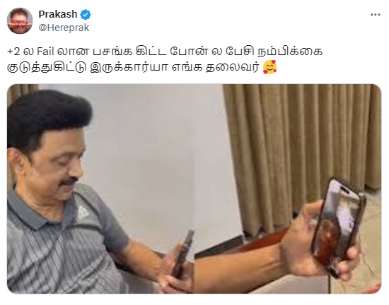 ”+2 ல Fail லான பசங்க கிட்ட போன்ல பேசி நம்பிக்கை குடுத்துகிட்டு இருக்கார்யா எங்க தலைவர்” என்று இந்த புகைப்படம் பரவி வருகிறது.