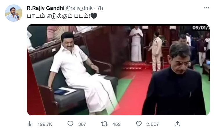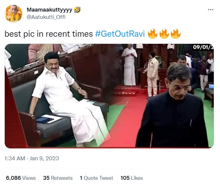 இந்நிலையில், தமிழ்நாடு ஆளுநர் அவையை விட்டு வெளியேறியபோது அவரை அவமதிக்கும் வகையில் முதல்வர் மு.க.ஸ்டாலின் அமர்ந்திருந்தார் என்பதாகவும், அதையே திமுகவினர் “பாடம் எடுக்கும் படம்” என்பதாகவும் பகிர்ந்து வருகின்றனர். அதற்கு பதிலளிக்கும் வகையில் பாஜகவினர் உள்ளிட்ட எதிர்க்கட்சியினர் முதலமைச்சர் மு.க.ஸ்டாலின் எழுந்து மரியாதை செலுத்தினார் என்பதாகவும் ஷேர் செய்து வருகின்றனர்.