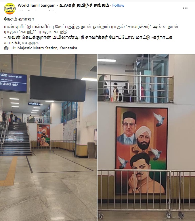 காங்கிரஸ் ஆட்சியில் கர்நாடகா மெட்ரோ ரயில் நிலையத்தில் சாவர்க்கர் ஓவியம் வரையப்பட்டதாகப் புகைப்படம் ஒன்று சமூக வலைத்தளங்களில் பரவி வருகிறது.
