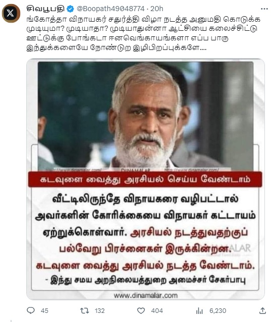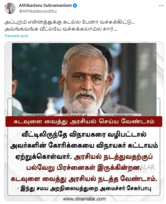”கடவுளை வைத்து அரசியல் செய்ய வேண்டாம். வீட்டிலிருந்தே விநாயகரை வழிபட்டால் அவர்களின் கோரிக்கையை விநாயகர் கட்டாயம் ஏற்றுக்கொள்வார். அரசியல் நடத்துவதற்குப் பல்வேறு பிரச்னைகள் இருக்கின்றன. கடவுளை வைத்து அரசியல் நடத்த வேண்டாம். இந்து சமய அறநிலையத்துறை அமைச்சர் சேகர்பாபு” என்று இந்த நியூஸ்கார்ட் பரவுகிறது.