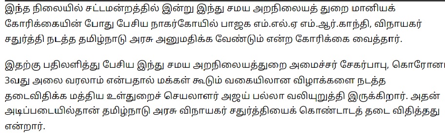 இதுகுறித்து செப்டம்பர் 04, 2021 அன்று பாஜக எம்எல்ஏ எம்.ஆர்.காந்தி எழுப்பிய கேள்விக்கு ”கொரோனா மூன்றாவது அலை உருவாகும் சூழல் காரணமாக மக்கள் கூடும் வகையில் விழாக்களை நடத்தத் தடை விதிக்க வேண்டும் என்று மத்திய அரசின் உள்துறைச் செயலாளர் அஜய் பல்லா சுற்றறிக்கை ஒன்றினை அனுப்பியுள்ளார். அதனடிப்படையில்தான் தமிழ்நாடு அரசு விநாயகர் சதுர்த்தி கொண்டாட்டத்துக்குக் கட்டுப்பாடுகளை விதித்துள்ளது” என்று பதிலளித்திருந்தார் என்பது குறிப்பிடத்தக்கது.