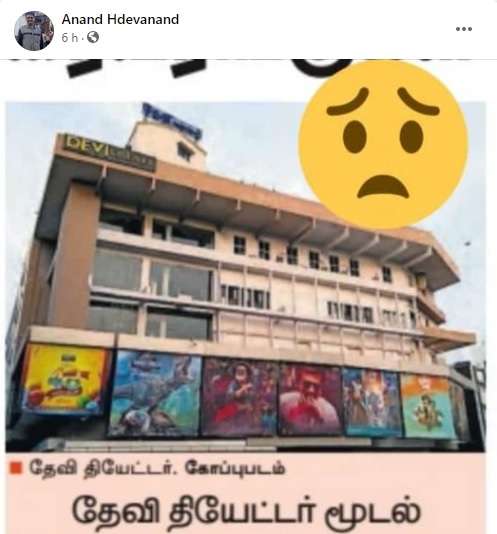 சென்னையின் பிரபல பழமை சிறப்பு வாய்ந்த தியேட்டர்களில் ஒன்றான தேவி சினிப்ளக்ஸ் மூடப்படுவதாக தகவல் ஒன்று முன்னணி செய்தி நிறுவனம் ஒன்றினால் வெளியிடப்பட்டிருந்தது. அதனை சமூக வலைத்தளத்தில் பலரும் பகிர்ந்து வருகின்றனர்.
