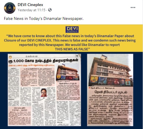 தொடர்ந்து, இதுகுறித்து தேவி தியேட்டரின் அதிகாரப்பூர்வ பேஸ்புக் பக்கத்தில் சென்று ஆராய்ந்தபோது, தேவி சினிப்ளெக்ஸ் சார்பில் குறிப்பிட்ட அச்செய்திக்கு மறுப்பு தெரிவித்து அறிக்கை ஒன்று வெளியிடப்பட்டுள்ளது.
