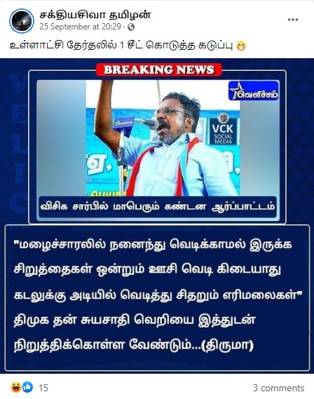 “இது பொய் செய்தி. இச்சம்பவம் குறித்த திருமாவளவன் அவர்களின் பேச்சு முழுமையாக பொது வெளியில் உள்ளது”