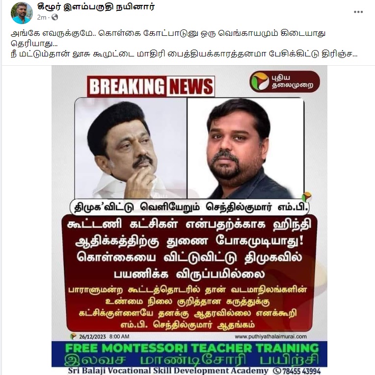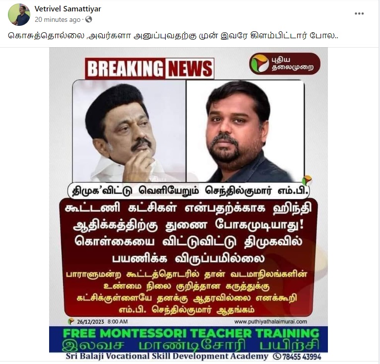 Facebook Post From, Puthiyathalaimurai, Dated December 27, 2023