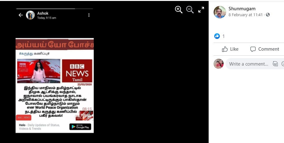 திமுக ஆட்சியில் அமர்ந்தால், ஐக்கிய நாடுகள் சபையால் பாகிஸ்தான் எவ்வாறு பயங்கரவாத நாடாக அறிவிக்கப்பட்டதோ அதே போன்று தமிழகமும் மாறும் என்று உலக அமைதிக்கான அமைப்பு கருத்துக் கணிப்பு முடிவு வெளியிட்டுள்ளதாகப் பிபிசி நிறுவனம் செய்தி வெளியிட்டுள்ளதாகப் புகைப்படச் செய்தி ஒன்று சமூக வலைத்தளமான ஷேர் சாட்டில் பகிரப்பட்டு வருகின்றது.