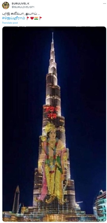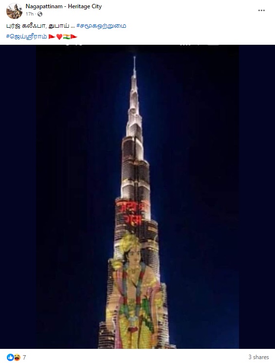 துபாய் புர்ஜ் கலீஃபாவில் ஒளிரும் ராமர் உருவம் என்று புகைப்படம் ஒன்று சமூக வலைதளங்களில் பரவுகிறது.
