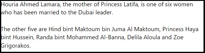 துபாய் மன்னரின் மூத்த மனைவியின் பெயர் Hind bint Maktoum bin Juma Al Maktoum என்றும் தெரிவிக்கப்பட்டிருந்தது. இதற்கு முன்பாக வெளியான சில பழைய செய்திகளிலும் அவரது பெயர் குறிப்பிடப்பட்டுள்ளது. Metro.co.uk என்கிற செய்தித்தளத்தில் வெளியான துபாய் ஆட்சியாளரின் மனைவிகள் குறித்த கட்டுரையில் அவரது பெயர் இடம்பெற்றுள்ளது.