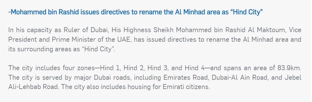 துபாய் மாவட்டத்திற்கு உண்மையில் ஹிந்த் சிட்டி என்று பெயரிடப்பட்டுள்ளதா என்று ஆராய்ந்தபோது ஜனவரி 29, 2023 அன்று துபாய் மன்னரும், ஐக்கிய அரபு எமிரேட்ஸ் துணை அதிபரான ஷேக் முகமது பின் ரஷீத் அல் மக்தூம், துபாயின் மின்ஹாத் மாவட்டத்தைச் சுற்றியுள்ள பகுதிகளுக்கு ஹிந்த் சிட்டி என்று பெயரிட்டதாக செய்தி வெளியாகியிருந்தது.