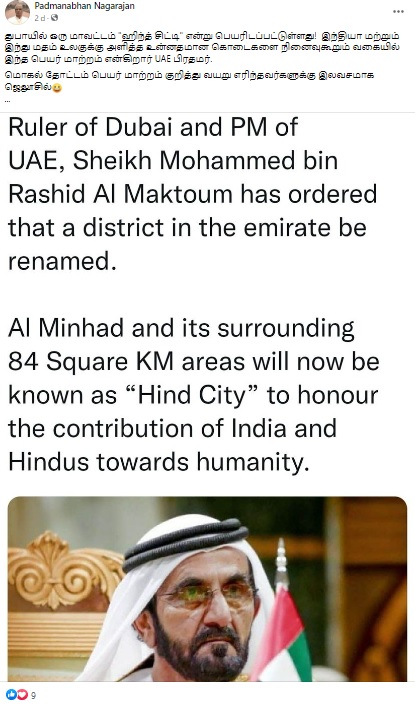“துபாயில் ஒரு மாவட்டம் “ஹிந்த் சிட்டி” என்று பெயரிடப்பட்டுள்ளது! இந்தியா மற்றும் இந்து மதம் உலகுக்கு அளித்த உன்னதமான கொடைகளை நினைவுகூறும் வகையில் இந்த பெயர் மாற்றம் என்கிறார் UAE பிரதமர். மொகல் தோட்டம் பெயர் மாற்றம் குறித்து வயறு எரிந்தவர்களுக்கு இலவசமாக ஜெலூசில்” என்பதாக இந்த செய்தி பரவுகிறது.