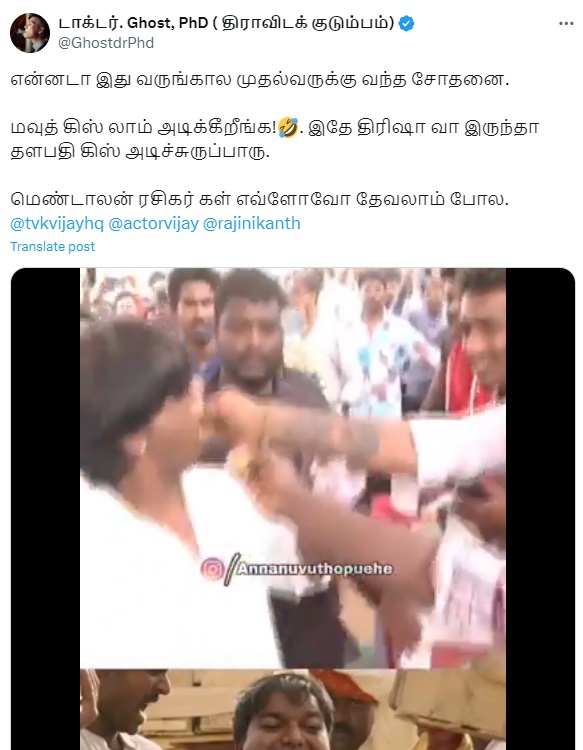 “என்னடா இது வருங்கால முதல்வருக்கு வந்த சோதனை.மவுத் கிஸ் லாம் அடிக்கீறீங்க!. இதே திரிஷா வா இருந்தா தளபதி கிஸ் அடிச்சுருப்பாரு. மெண்டாலன் ரசிகர்கள் எவ்ளோவோ தேவலாம் போல. ” என்று இந்த வீடியோ வைரலாகிறது.