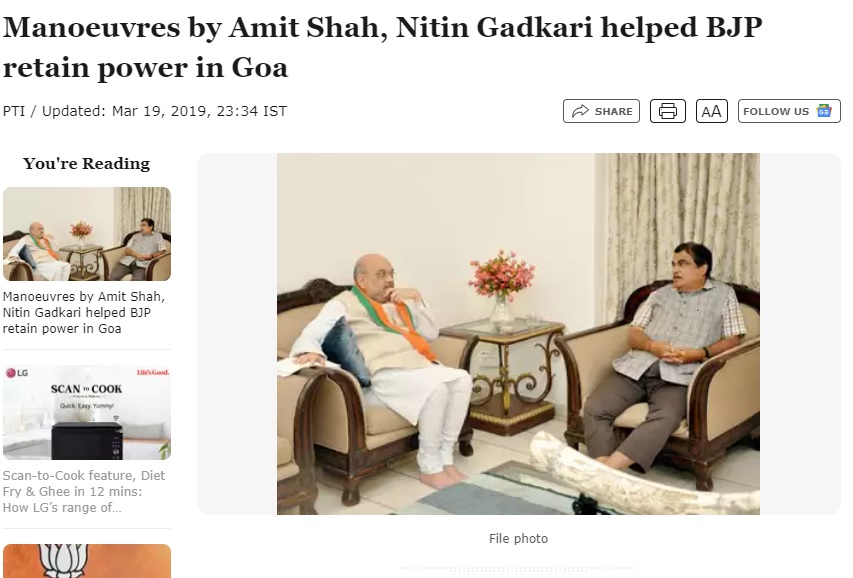 கடந்த மார்ச் 19, 2019 அன்று Time OF India வெளியிட்டிருந்த “Manoeuvres by Amit Shah, Nitin Gadkari helped BJP retain power in Goa” என்னும் கட்டுரையில் அமித்ஷா மற்றும் நிதின் கட்கரி ஒன்றாக அமர்ந்து உரையாடும் புகைப்படம் ஒன்று இடம்பெற்றிருந்தது.