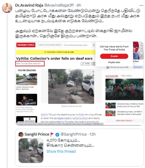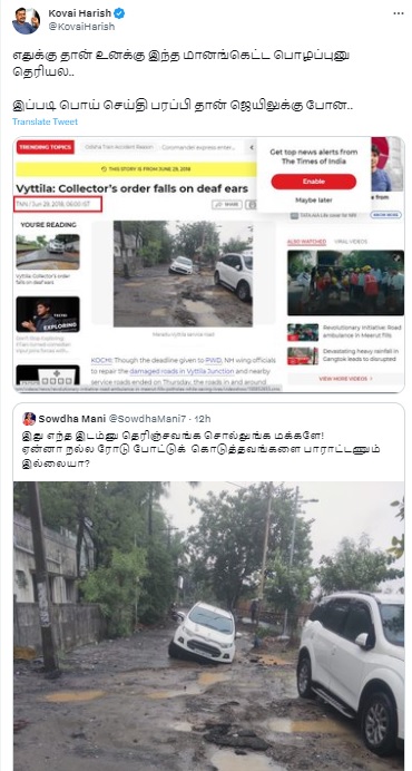 இந்நிலையில், மடிப்பாக்கம் சாலையின் நிலைமை என்று அவர் பகிர்ந்திருந்த புகைப்படத்தையே பாஜகவினர் பலரும் பகிர்ந்து வருகின்ற நிலையில் அப்புகைப்படம் கடந்த 2018ஆம் ஆண்டு கேரளாவில் எடுக்கப்பட்டது என்றும், “Vyttila: Collector’s order falls on deaf ears” என்கிற தலையில் 2018ஆம் ஆண்டு வெளியான டைம்ஸ் ஆஃப் இந்தியா செய்தியில் இடம்பெற்றிருப்பதாகவும் பலரும் விமர்சித்து வருகின்றனர்.