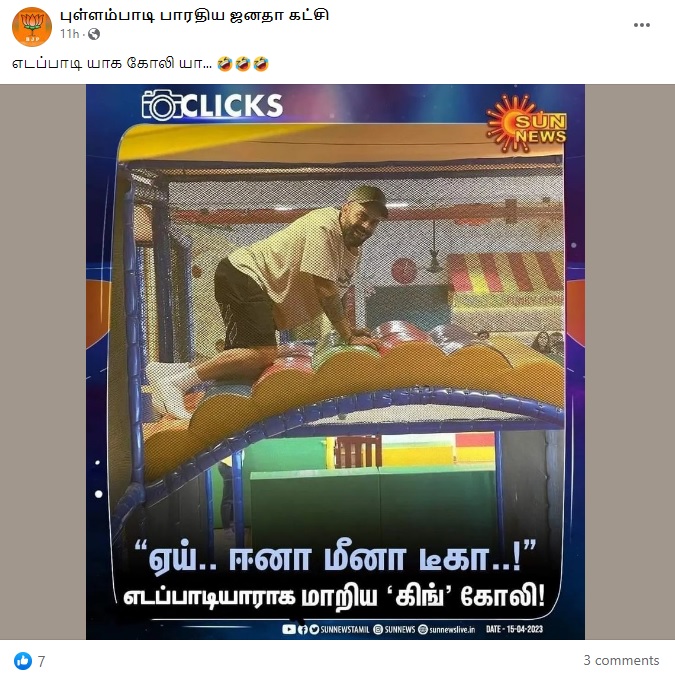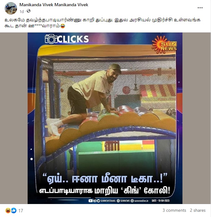 இதனைத் தொடர்ந்து, சன் நியூஸ் இப்புகைப்படத்தை “ஏய் ஈனா மீனா டீகா! குழந்தையாக மாறிய ‘கிங்’ கோலி!” என்று நியூஸ்கார்டாக பதிவிட்டுள்ளது.