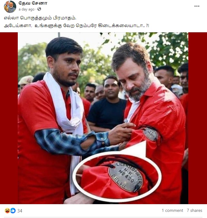காங்கிரஸ் கட்சியின் அதிகாரப்பூர்வ சமூக வலைத்தளப்பக்கத்தில் கடந்த செப்டம்பர் 21ஆம் தேதியன்று ராகுல் காந்தி சுமை தூக்கும் தொழிலாளர்களைச் சந்தித்த நிகழ்வு தொடர்பான புகைப்படங்கள் இடம்பெற்றிருந்தன.