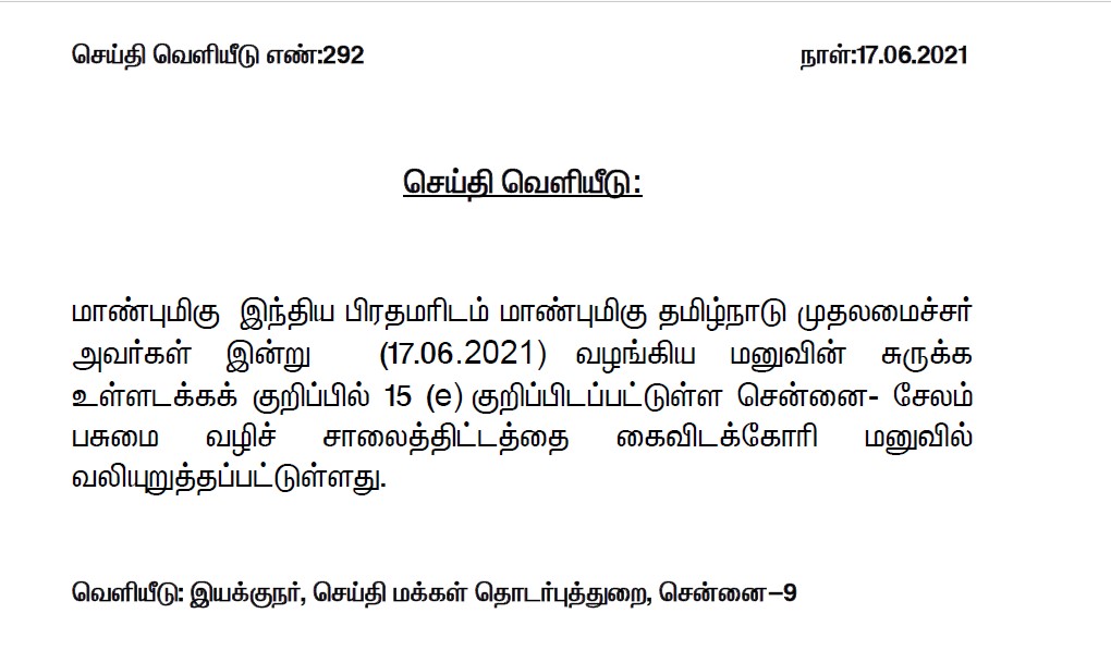 முதல்வர் பிரதமரிடம் வைத்த கோரிக்கை மனுக் குறித்த விவரங்கள் தமிழக அரசின் அதிகாரப் பூர்வ இணையத்தளத்தில் வெளியிடப்பட்டிருந்தது. இந்த செய்தி வெளியீட்டில் 15 (e) -இல் “Chennai-Salem Greenfield Expressway” என்று குறிப்பிடப்பட்டிருந்தது.