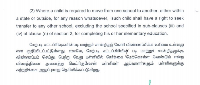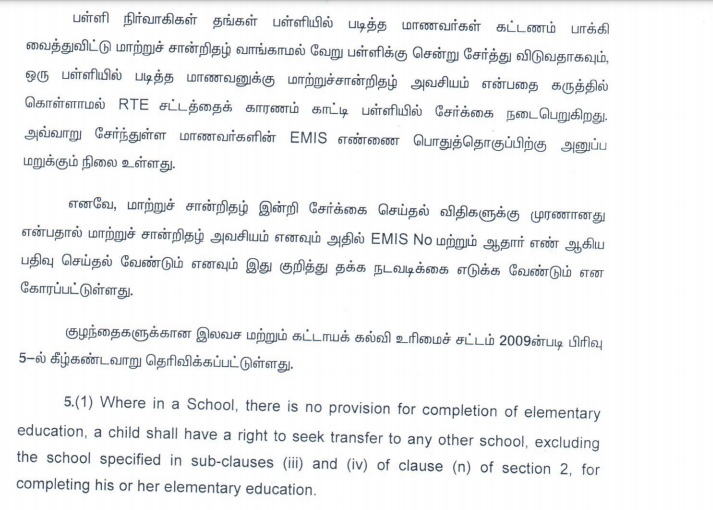 (எனினும், கல்விக்கட்டணம் செலுத்த இயலாத நிலையில் மாணவர்களுக்கு கல்வியை மறுக்கவோ, மாற்றுச்சான்றிதழ் வழங்காமல் அழைக்கழிக்கவோ பள்ளிகளுக்கு எவ்வித உரிமையும் இல்லை; இதுகுறித்து அரசு தக்க தீர்வு காணவேண்டும் என்பதும் குறிப்பிடத்தக்கது.)