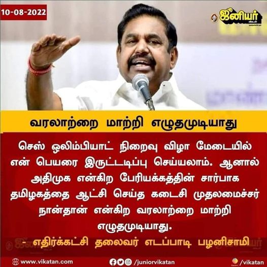 “செஸ் ஒலிம்பியாட் நிறைவு விழா மேடையில் என் பெயரை இருட்டடிப்பு செய்யலாம். ஆனால் அதிமுக என்ற பேரியக்கத்தின் சார்பாக தமிழகத்தை ஆட்சி செய்த கடைசி முதலமைச்சர் நான்தான் என்கிற வரலாற்றை மாற்றி எழுத முடியாது” என்று எடப்பாடி பழனிசாமி கூறியதாக நியூஸ்கார்ட் ஒன்று சமூக வலைத்தளங்களில் பரவி வருகின்றது.