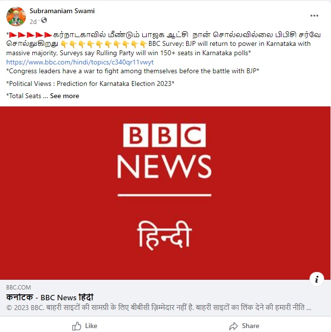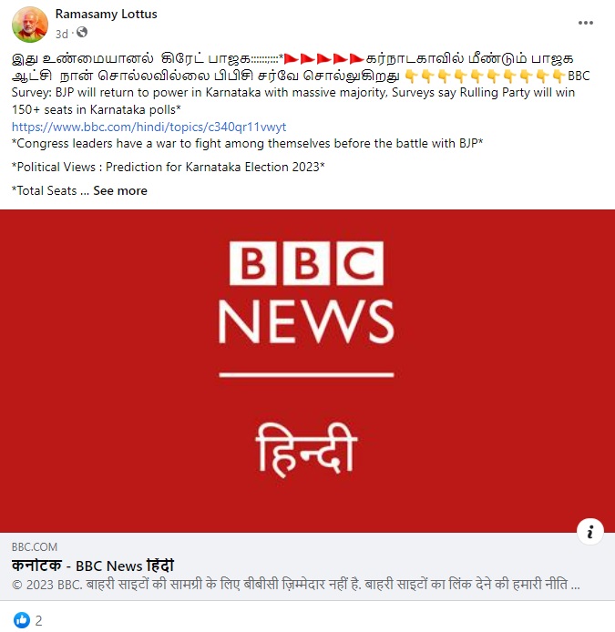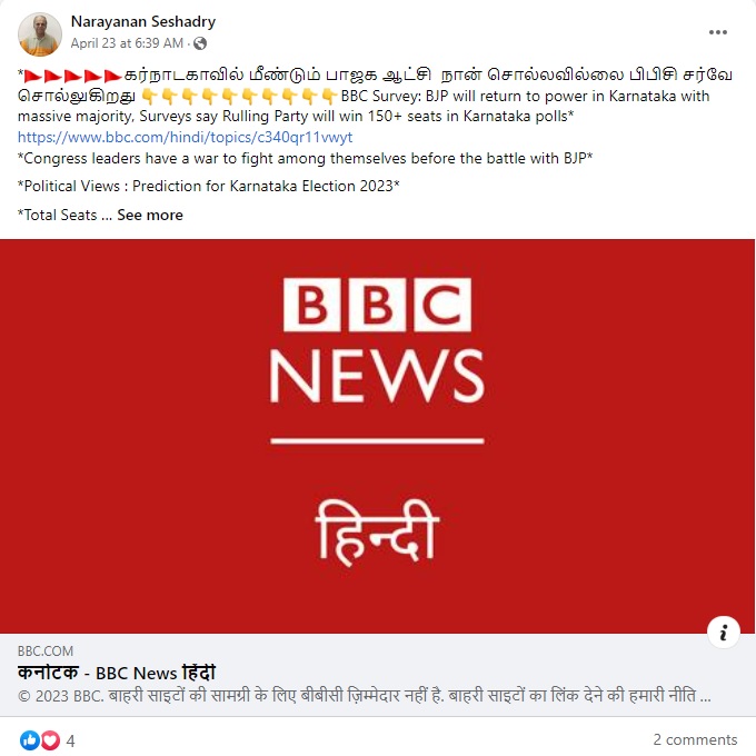 கர்நாடகாவில் மீண்டும் ஆட்சி அமைக்கும் பாஜக என்று பிபிசி சர்வே ஒன்று வெளியிட்டதாக தகவல் சமூக வலைத்தளங்களில் பரவிய நிலையில் அதுகுறித்த ஆய்வில் ஈடுபட்டோம்.