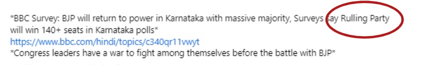 இதுதொடர்பாக, மே 2018ல் BBC News Indiaவிலும் விளக்கம் இடம்பெற்றுள்ளது. அதில், “A fake survey on Karnataka polls has been circulating on WhatsApp and claims to be from BBC News. We’d like to make absolutely clear that it’s a #fake and does not come from the BBC. The BBC does not commission pre-election surveys in India. #fakenews.” என்று விளக்கமளிக்கப்பட்டுள்ளது.