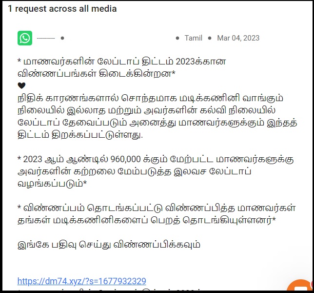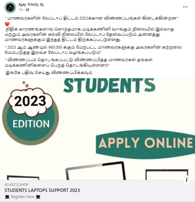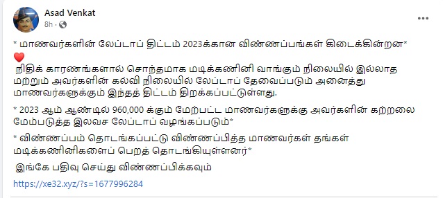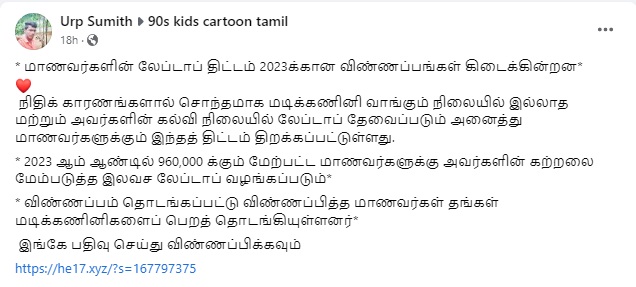“மாணவர்களின் லேப்டாப் திட்டம் 2023க்கான விண்ணப்பங்கள் கிடைக்கின்றன. நிதிக்காரணங்களால் சொந்தமாக மடிக்கணினி வாங்கும் நிலையில் இல்லாத மற்றும் அவர்களின் கல்வி நிலையில் லேப்டாப் தேவைப்படும் அனைத்து மாணவர்களுக்கும் இந்த திட்டம் திறக்கப்பட்டுள்ளது. 2023 ஆம் ஆண்டில் 960,000 க்கும் மேற்பட்ட மாணவர்களுக்கு அவர்களின் கற்றலை மேம்படுத்த இலவச லேப்டாப் வழங்கப்படும். விண்ணப்பம் தொடங்கப்பட்டு விண்ணப்பித்த மாணவர்கள் தங்கள் மடிக்கணினிகளைப் பெறத் தொடங்கியுள்ளனர்.இங்கே பதிவு செய்து விண்ணப்பிக்கவும்.” என்பதாக இந்த தகவல் பரவி வருகிறது.