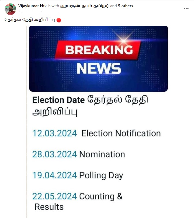 Fact: வைரலாகும் படம் போலியானதாகும். தேர்தல் ஆணையம் இன்னும் அதிகாரப்பூர்வமாக எந்த தேதியும் அறிவிக்கவில்லை.