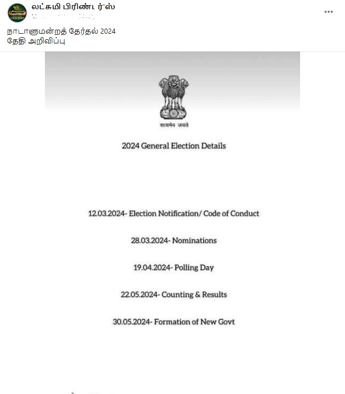2024ஆம் ஆண்டு மக்களவைத் தேர்தலுக்கான தேதி ஏப்ரல் 19 என்று அறிவிக்கப்பட்டதாகப் புகைப்பட தகவல் ஒன்று சமூக வலைத்தளங்களில் பரவி வருகிறது.