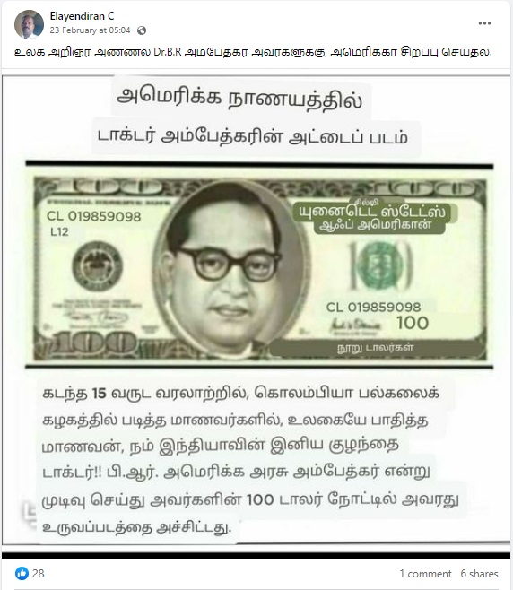 அமெரிக்க 100 டாலர் நோட்டில் அம்பேத்கர் படம் இடம்பெற்றுள்ளதாகப் புகைப்படத்தகவல் ஒன்று சமூக வலைத்தளங்களில் பரவி வருகிறது.
