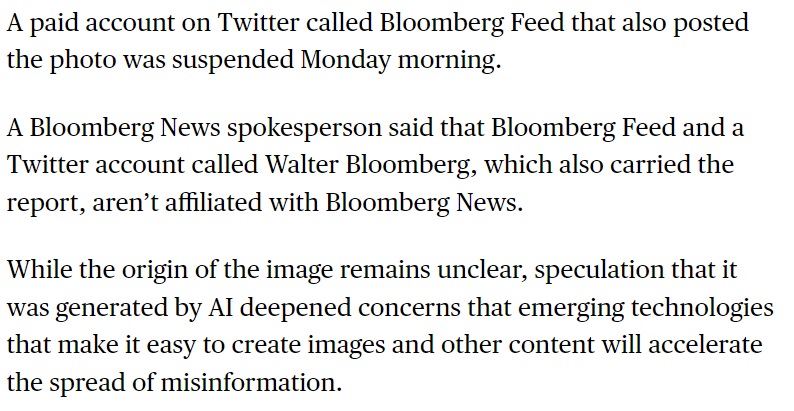 இதுகுறித்து, Bloomberg தனது இணையதளத்தில் “How Fake AI Photo of a Pentagon Blast Went Viral and Briefly Spooked Stocks” என்று செய்தி வெளியிட்டுள்ளது. மேலும், ரஷ்ய ஊடக பிரிவான RT, Zerohedge, Bloomberg Feed உள்ளிட்ட சமூக வலைத்தளப் பக்கங்களே இப்புகைப்படத்தை முதலில் பகிர்ந்ததாகவும் செய்திகள் தெரிவிக்கின்றன.