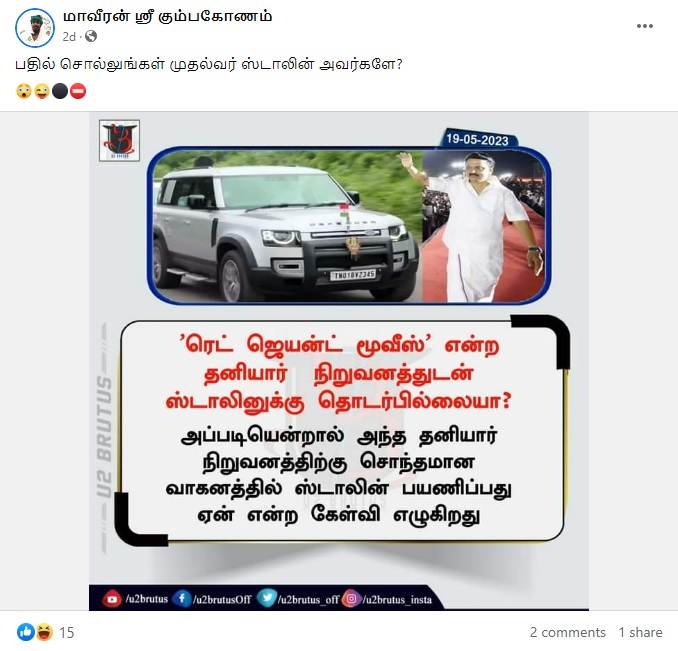 “ரெட் ஜெயன்ட் மூவிஸ் என்ற தனியார் நிறுவனத்துடன் ஸ்டாலினுக்கு தொடர்பில்லையா? அப்படியென்றால் அந்த தனியார் நிறுவனத்திற்கு சொந்தமான வாகனத்தில் ஸ்டாலின் பயணிப்பது ஏன் என்ற கேள்வி எழுகிறது” என்று U2Brutus மைனர் வீரமணி கேள்வி எழுப்பியதாக அப்புகைப்படம் பரவி வருகிறது.