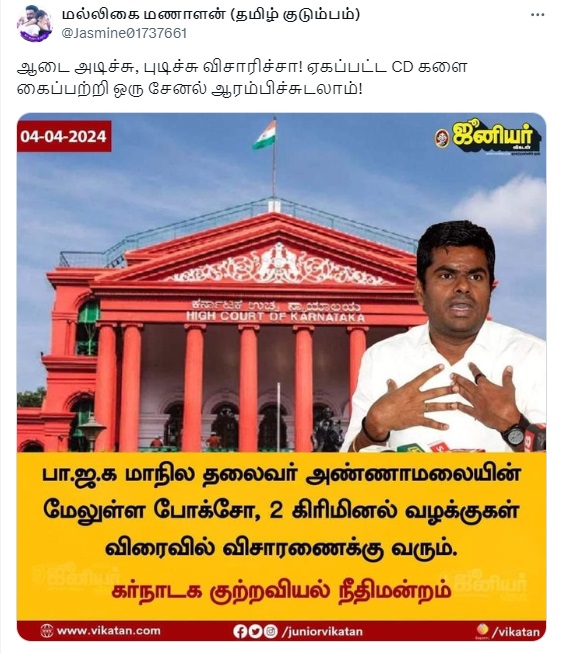 “பா.ஜ.க மாநில தலைவர் அண்ணாமலையின் மேலுள்ள போக்சோ, 2 கிரிமினல் வழக்குகள் விரைவில் விசாரணைக்கு வரும்.கர்நாடக குற்றவியல் நீதிமன்றம்” என்று ஜூனியர் விகடன் வெளியிட்டதாக ஏப்ரல் 04ஆம் தேதியிட்டு இந்த நியூஸ்கார்ட் பரவி வருகிறது.